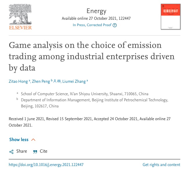 电子信息(计算机技术)专业硕士研究生洪子涛同学、导师张留美副教授和北京石油化工学院彭珍教授共同合作撰写的论文《Game analysis on the choice of emission trading among industrial enterprises driven by data》,日前收到国际SCI期刊《Energy》的论文录用接收函,并已完成对该论文样稿的校对,在该期刊网上上线。据悉,《Energy》是由英国佩加蒙爱思唯尔科学有限公司出版,是能源动力领域国际Top期刊,目前影响因子7.147。在中国科学院文献情报中心期刊分区表中(2020年12月最新升级版),属于一区刊物。