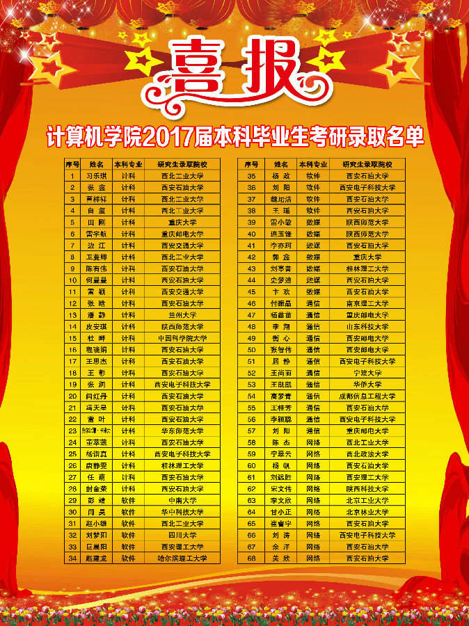 2017届本科毕业生考研工作传来捷报。共有80名同学考研上线,占毕业生总数22.5%,68名同学考研成功,考研录取率为19.1%,创5278论坛