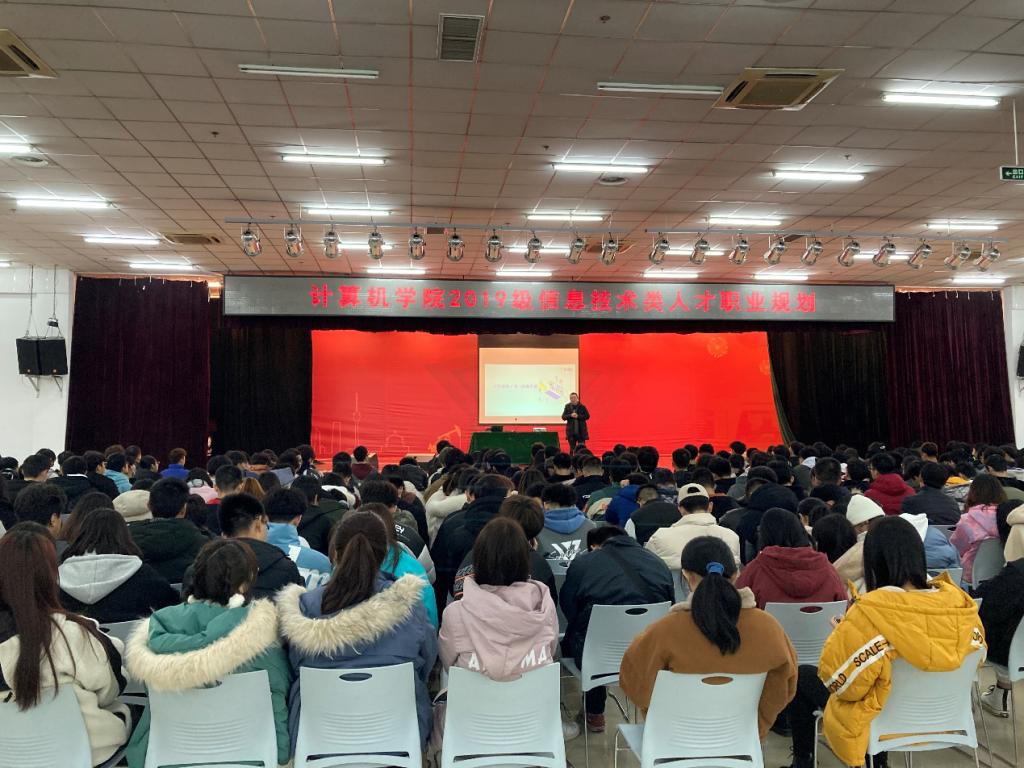 在鄠邑校区腾辉活动中心举办“信息技术类人才职业规划”报告会。前阿里P9,10年互联网行业从业经验,阿里最年轻的资深专家之一焦英俊老师受邀为大家作报告,辅导员王天航及全体2019级学生参加报告会。