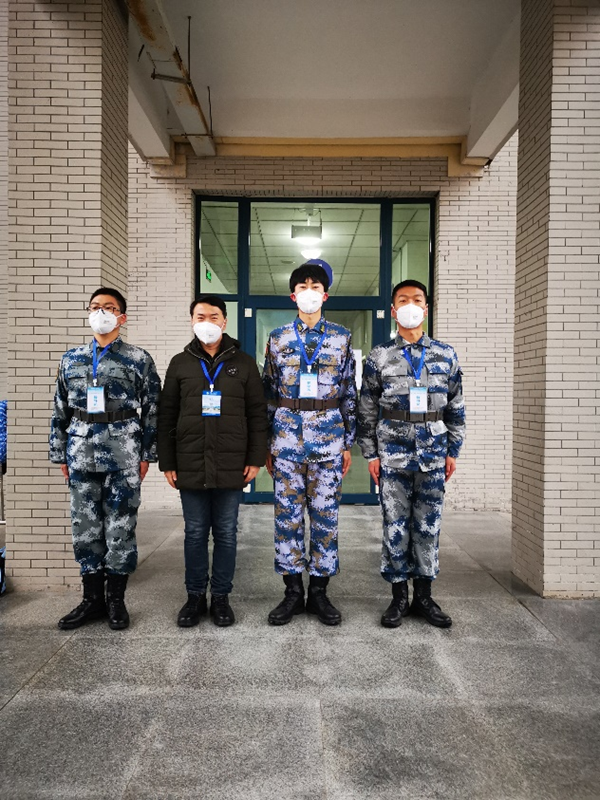 张峻宇(右二)同学与保卫处袁坤老师及队员完成封控区考场任务
