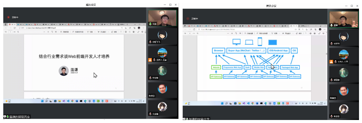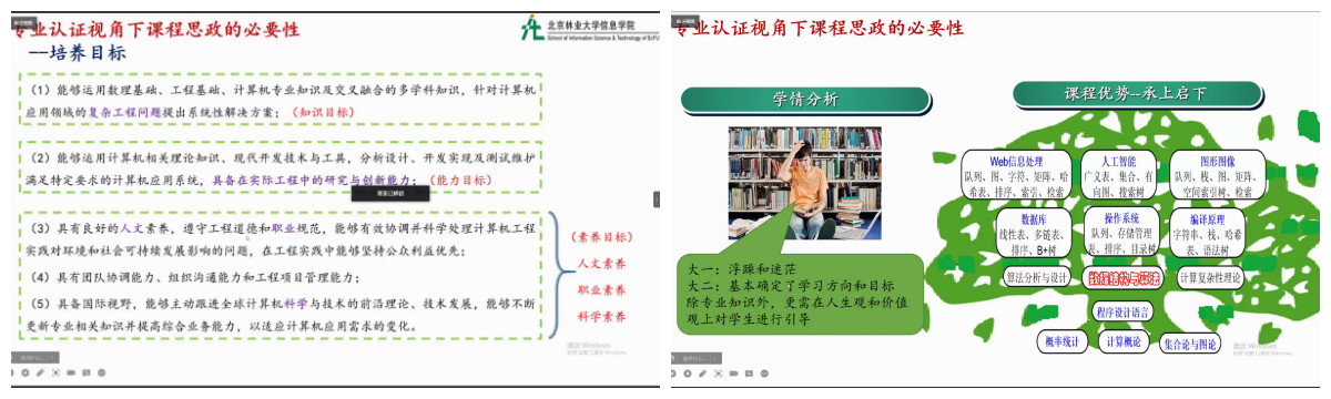为促进本科教学课程思政建设,提升课程思政育人实效,实现专业课程与思想政治理论课同向同行、协同育人,落实立德树人根本任务,于2022年4月开展计算机类系列课程思政线上教学研讨。学期中,计算机科学与技术专业全体教师于参加了“数据结构课程教学改革—课程思政、工程认证教育与线上线下混合式教学”,网络工程专业全体教师参加了“结合行业需求谈Web前段开发人才培养”,基础教研室参加了“Python语言基础与数据分析课程建设经验分享”。