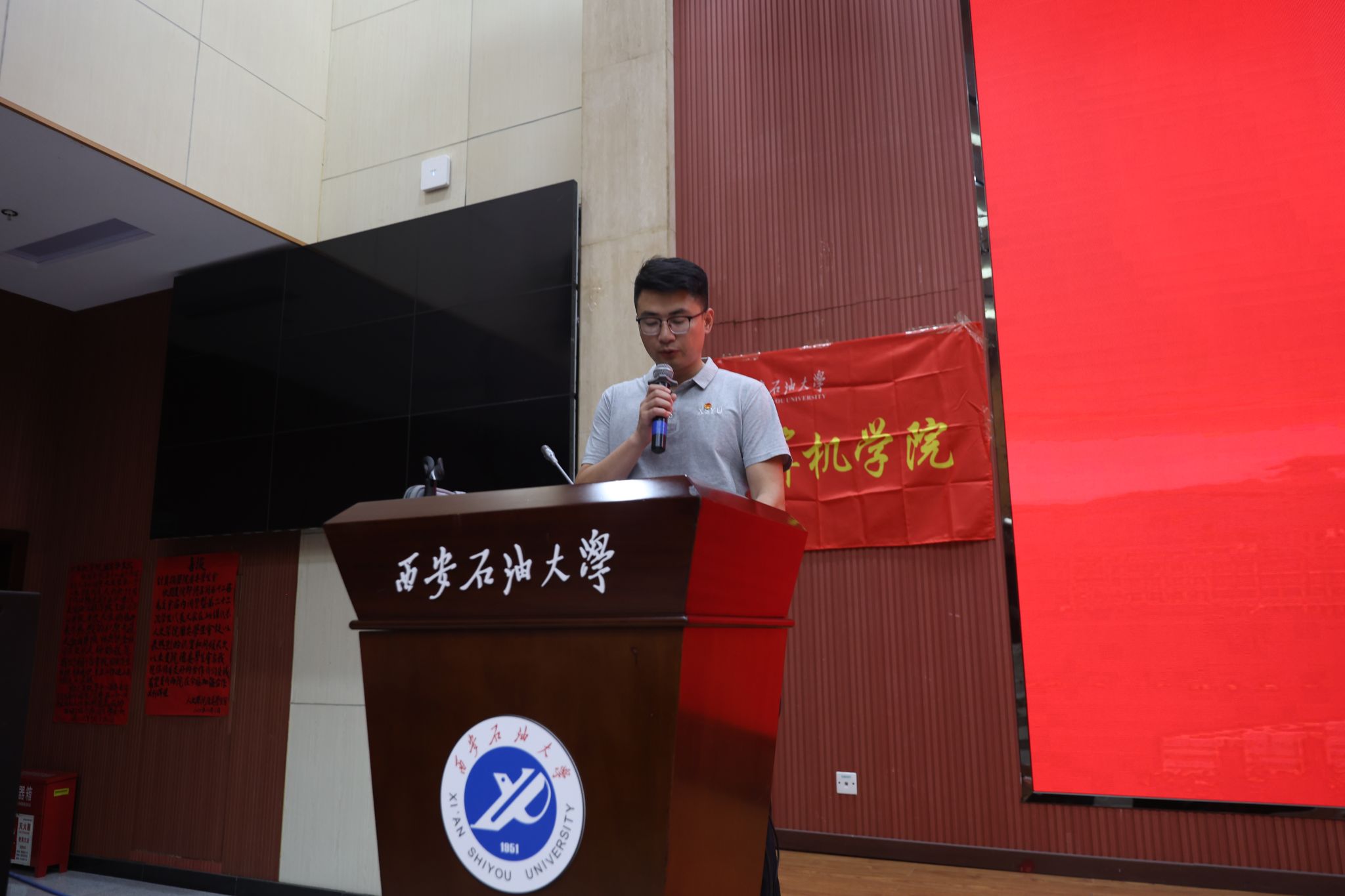 第二十一届学生会委员、学生会主席任卢轩同学上台作第二十一届学生会工作报告。