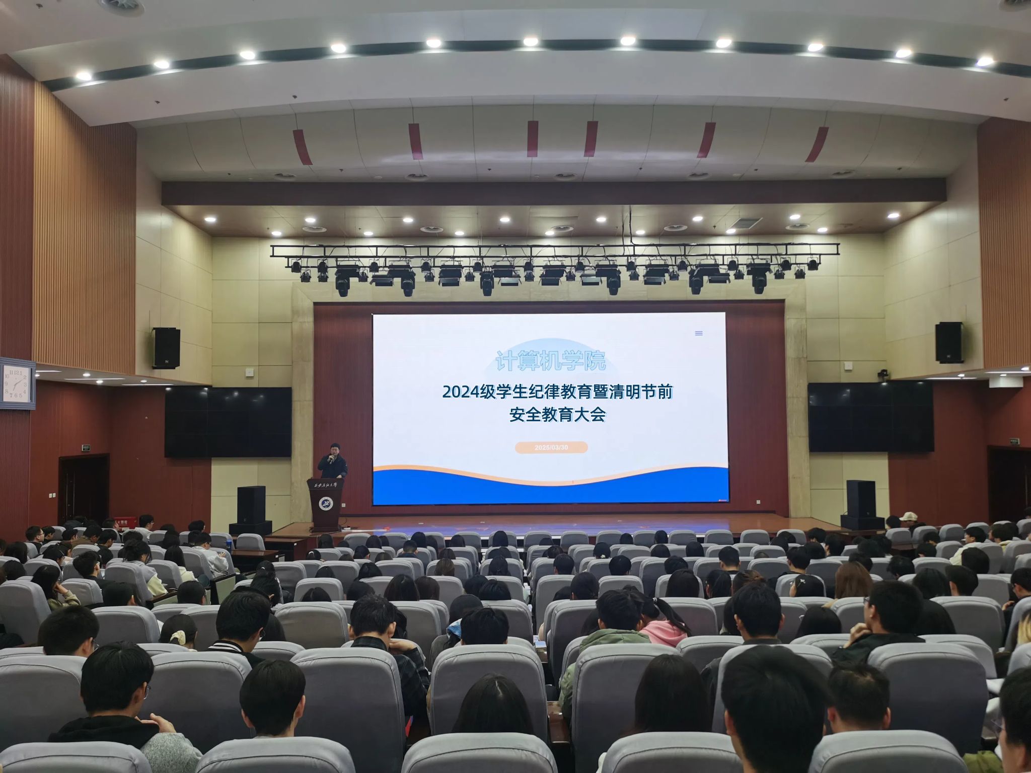 鄠邑校区弘石报告厅组织召开2024级学生清明节节前安全教育大会。会议由学院2024级辅导员李晨主持,全体2024级本科生参会。