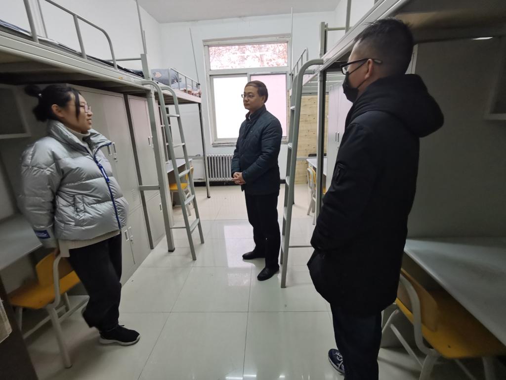 党委书记李强、学工办主任王军策、硕士生导师潘少伟前往学生宿舍走访慰问学院研一留校学生马金采,了解其因疫情影响留校期间的实际需求,并有针对性地给予指导和帮助,送去学院的慰问和关怀。