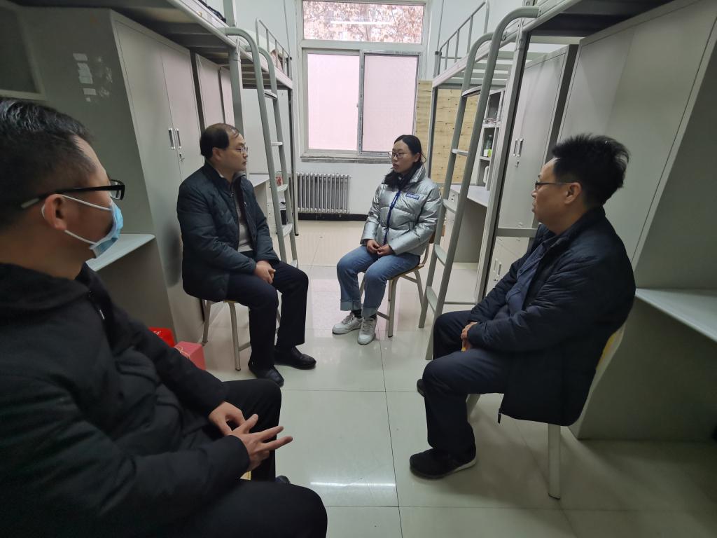 党委书记李强、院长王魁生、学工办主任王军策、硕士生导师潘少伟前往学生宿舍走访慰问学院因疫情原因不能返乡过年的研一学生马金采,为其送上新春的祝福及慰问品。