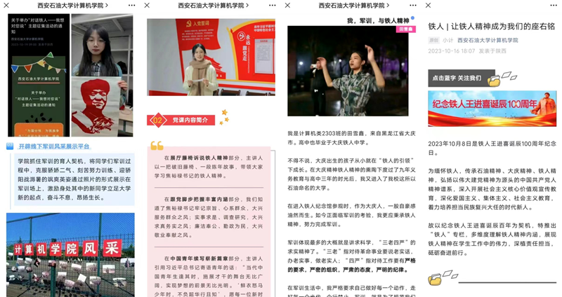 在学院的教育和传播过程中,思想指导行动的原则是至关重要的。石油院校培养学生的铁人精神,不仅是课堂教学的一部分,也是学院公众号建设的重要内容。铁人精神,代表了坚韧不拔、勇于创新、无私奉献的品质,是石油工业发展不可或缺的精神支柱。然而,简单的说教往往难以触及学生的心灵,甚至可能引起他们的抵触情绪。相对于抽象的讲授,身边的实际例子更能生动地传达铁人精神的内涵。因此,借助铁人诞辰百年这样的重要时刻,开展“铁人”专栏就显得尤为意义重大。通过“铁人”专栏,可以挖掘和报道那些在日常学习、科研、社会实践等方面体现出铁人精神的在校生事迹。将这些鲜活的故事与铁人精神相联系,不仅能够展现学生的积极风貌,还能激励更多的同学去认识和理解铁人精神的深刻含义。